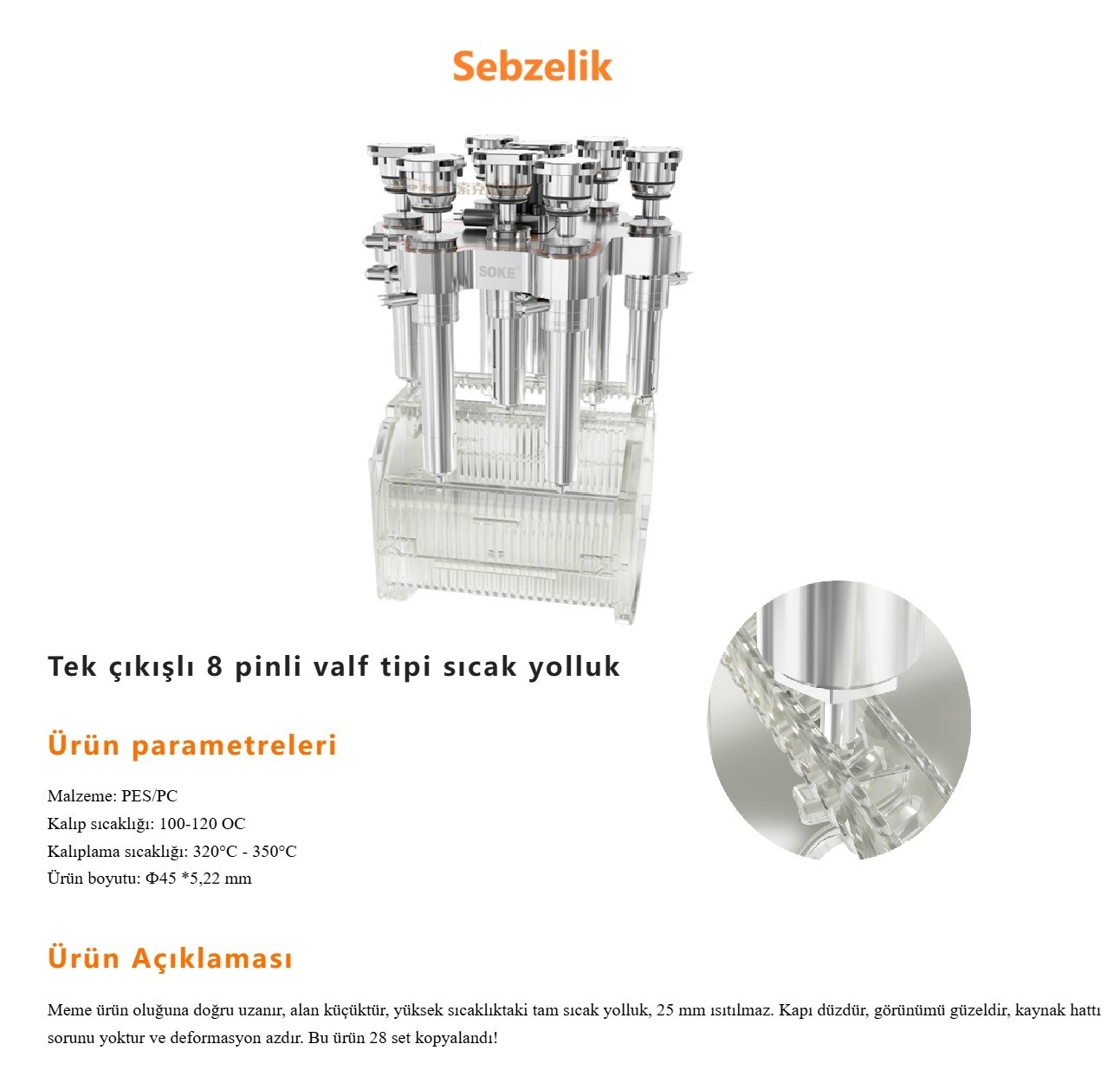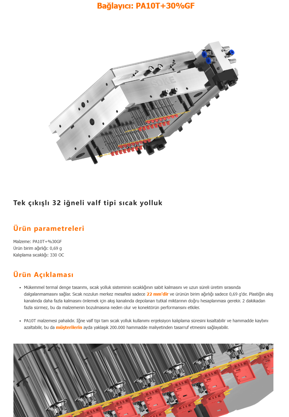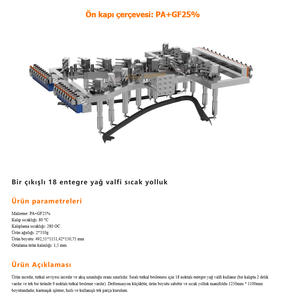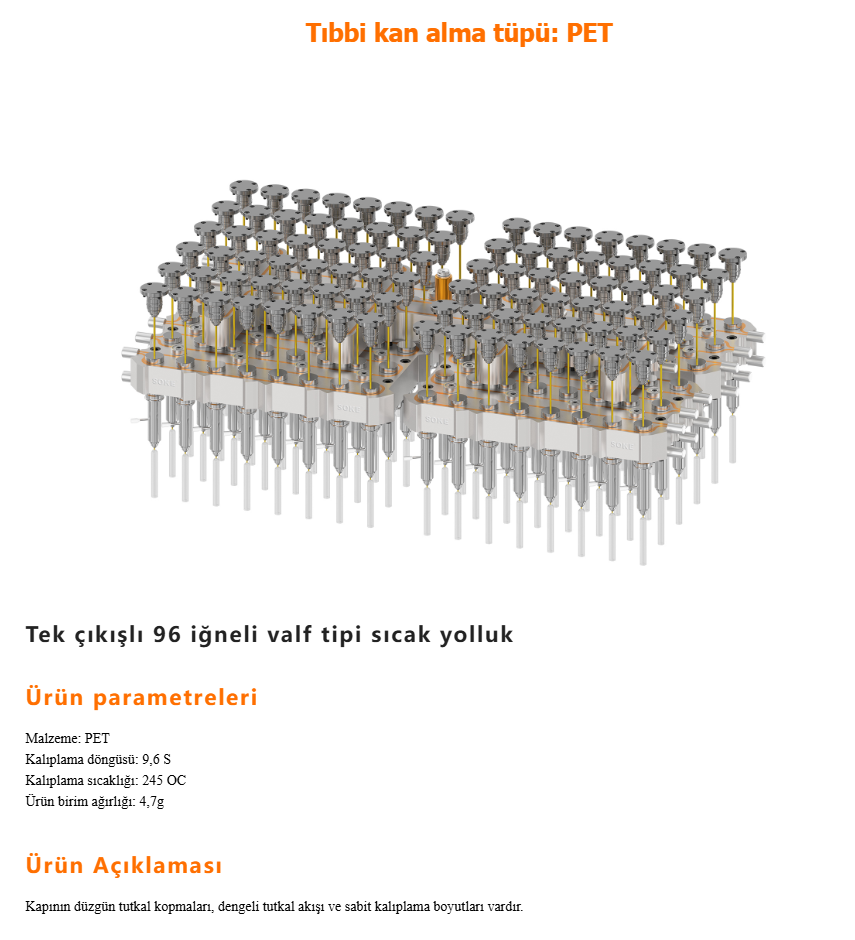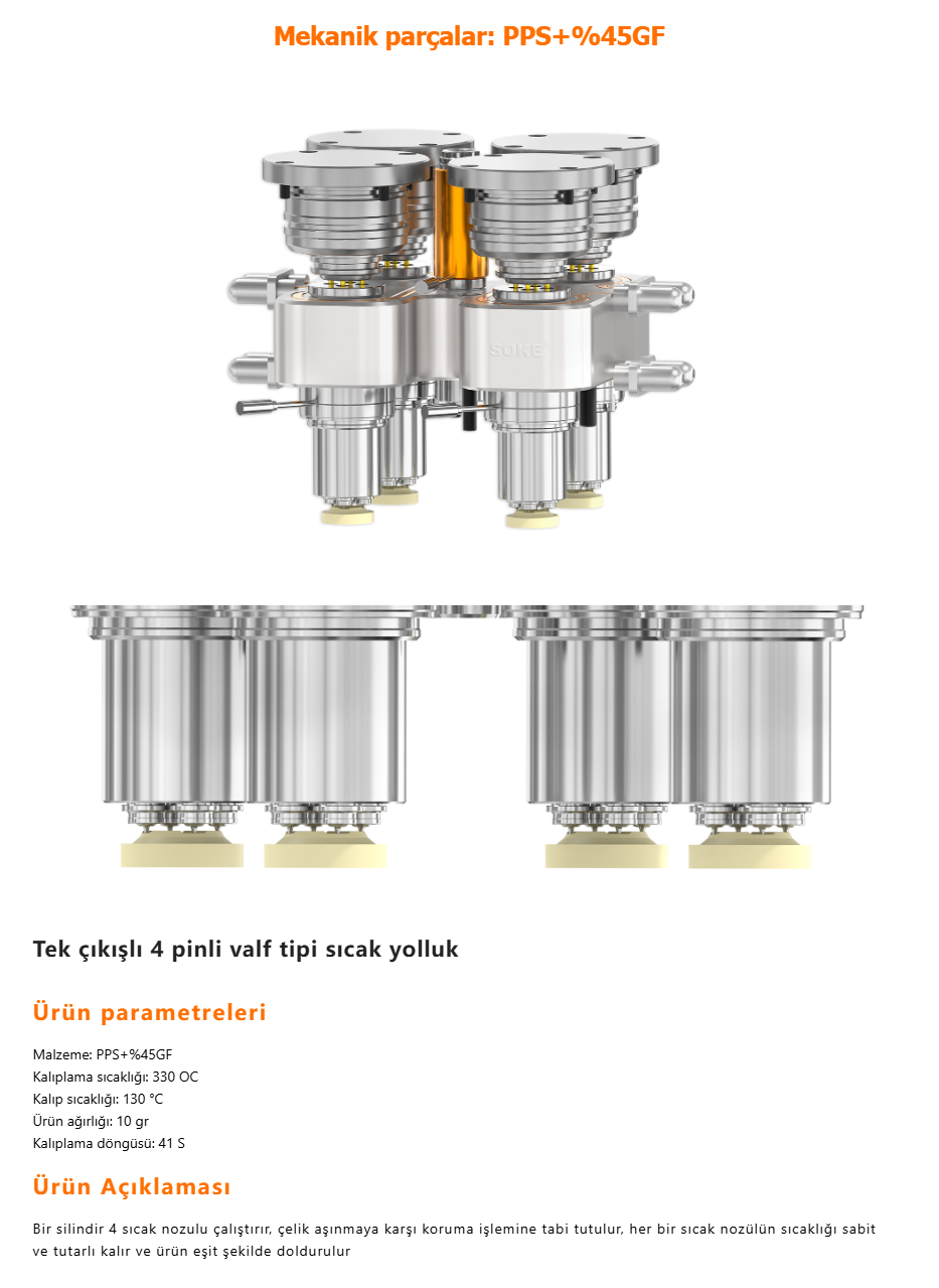 Ürettiğimiz sıcak yolluklar kozmetik, ambalaj, beyaz eşya, ev aletleri, otomobil v.b sektörlerde sorunsuz bir şekilde kullanılmaktadır. Süper mühendislik plastikleri işleyen müşterilere (elektrik, iletişim, mekanik parçalar, tıbbi, kimya vb.) çözümler sunmaktayız.